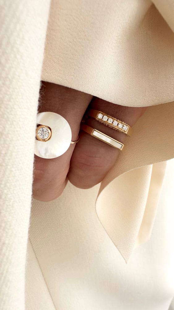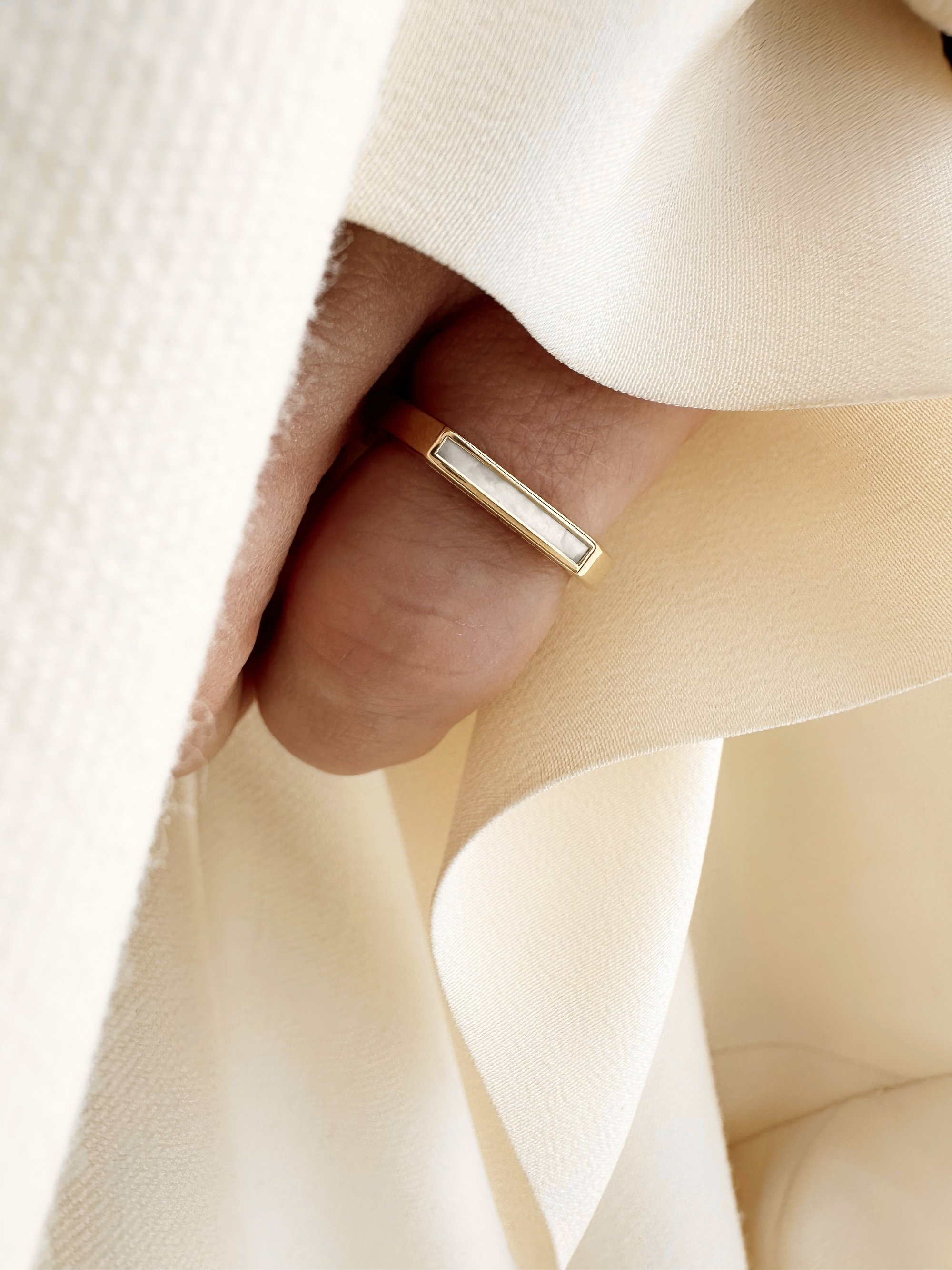 Bague sertie sur 3 faces avec de la nacre blanche.
