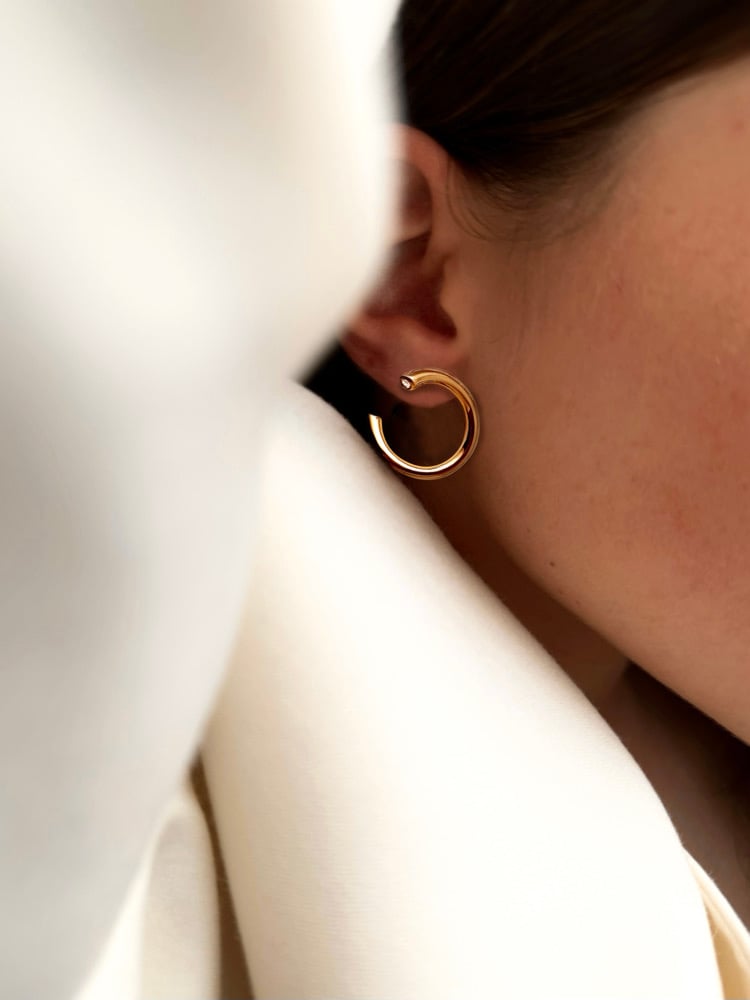 Boucles d'oreille avec extremités en zircons blancs, dessinées dans mon atelier en région parisienne.