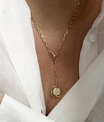 Ce collier est d'une longueur de 50cm avec une maille oversize et un mousqueton en crochet qui vous permet de le porter en version classique ou cravate à la taille souhaitée.