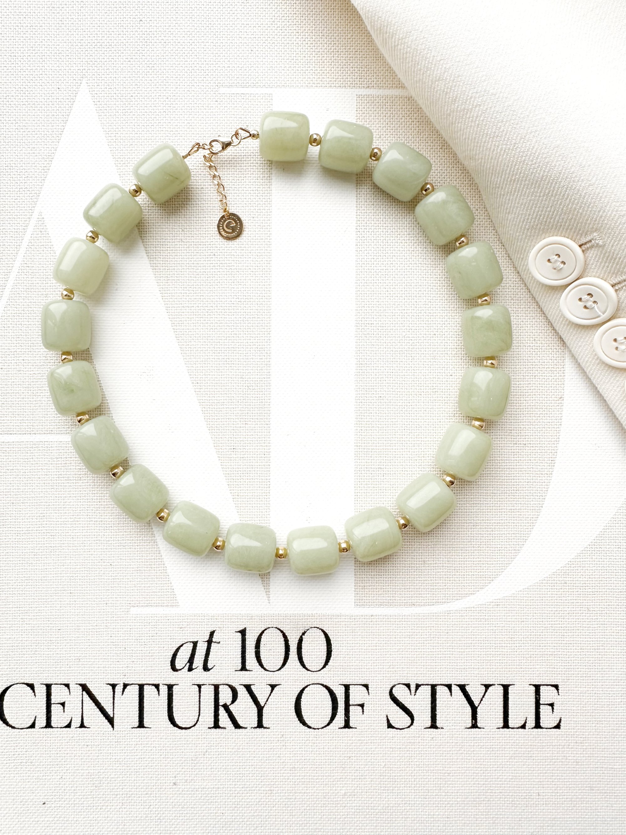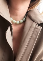 Collier de perles vertes en résine et plaqué or.